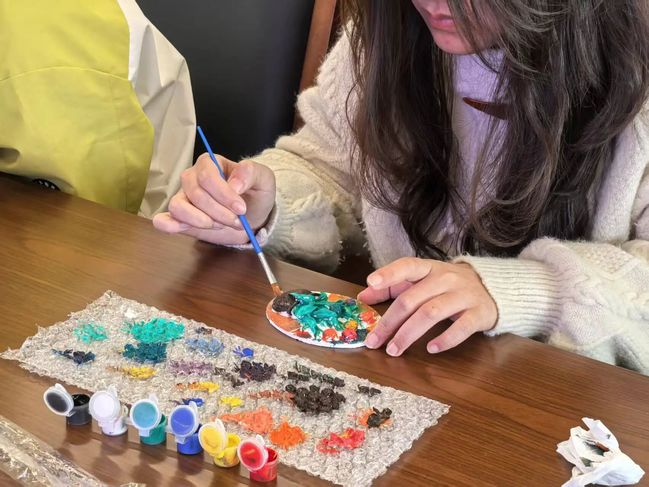 石膏花绘制区,洁白的石膏花胚与缤纷画材已备好。在主持人的简单讲解后,同学们即刻开始了沉浸式创作,调色、描瓣,把心绪与想象都融进画笔中,手上的石膏花或绚烂奔放,或淡雅温柔,每一朵都是当下心境的鲜活表达。在专注创作间,同学们的日常压力悄然消散。