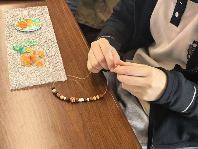 印象手串制作同样趣味十足。同学们从琳琅满目的珠子中,挑选出能够承载自己心情、记忆或期许的款式,亲手编织成独一无二的饰品。在同学们的创作下,手串不仅是精美的配饰,更是可视化的积极暗示,时刻提醒着我们要珍惜当下、留存美好。