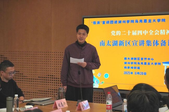 活动现场,best365官网登录入口专任教师刘志刚作专题辅导。刘志刚结合鲜活案例与详实数据,系统解读全会核心要义、精神实质及实践要求,帮助宣讲员理清理论脉络、深化理解。南太湖新区文化特派员刘海洲分享实践体悟,提出基层宣讲需扎根群众、立足实践,用通俗语言和喜闻乐见的形式传递全会精神,让理论更具温度与地气。现场还组织观摩浙江省优秀宣讲员示范宣讲视频,为参训人员提供直观学习范本,助力其积累宣讲技巧与实践经验。