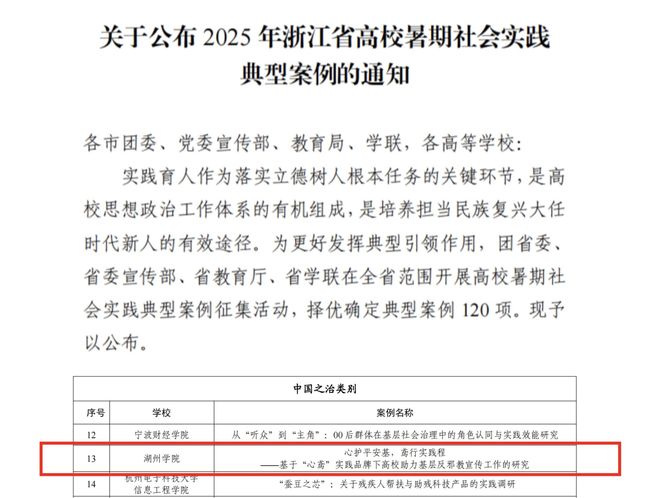 近日,共青团浙江省委、中共浙江省委宣传部、浙江省教育厅及浙江省学生联合会联合公布了2025年浙江省高校暑期社会实践典型案例评选结果。在全省评选出的120项典型案例中,我院“浙水涤邪跟党走,湖山先锋扬正气”实践团撰写的《心护平安基,鸢行实践程——基于“心鸢”实践品牌下高校助力基层反邪教宣传工作的研究》入选“中国之治”类别。